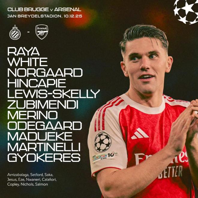 北京时间12月11日4:00,欧冠联赛阶段第6轮,阿森纳作客扬-布雷德尔球场挑战布鲁日,本场主裁判为雅布隆斯基,赛前双方首发出炉。阿森纳首发:1-戴维-拉亚、4-本-怀特、16-内尔高、5-因卡皮耶、49-刘易斯-斯凯利、36-苏比门迪、23-梅里诺、8-厄德高、20-马杜埃凯、11-马丁内利、14-哲凯赖什替补:13-凯帕、35-塞特福德、7-萨卡、9-热苏斯、10-埃泽、22-恩瓦内里、33-卡拉菲奥里、38-路易-科普利、48-乔希-尼科尔斯、89-马利-萨蒙【上咪咕独家看英超